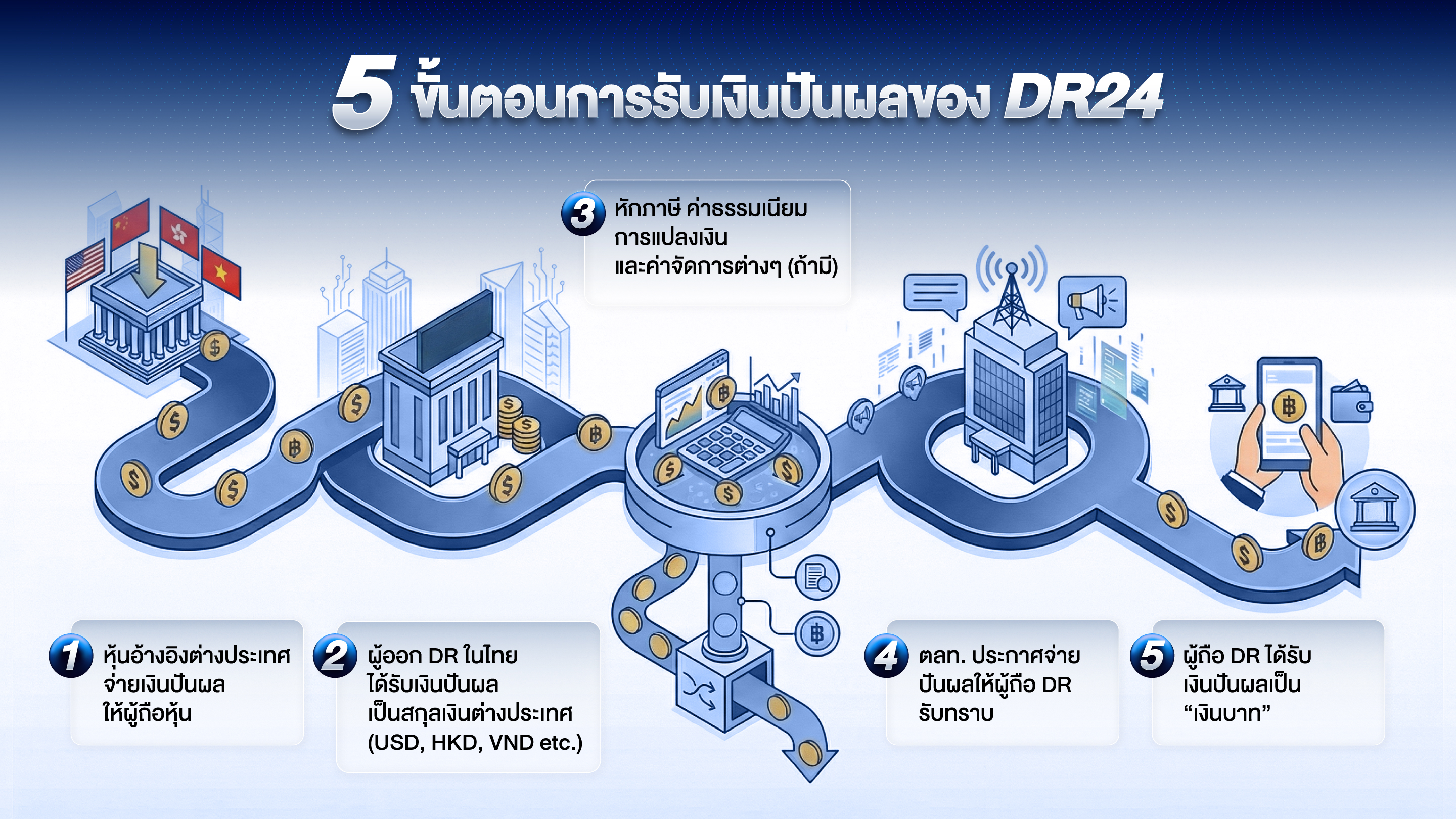 - ผู้ออก DR ในไทย (เช่น บล.ผู้ออก DR) จะได้รับเงินปันผลเป็นสกุลเงินต่างประเทศ (เช่น USD, HKD) ผ่านธนาคารผู้ดูแลทรัพย์สิน (Custodian)