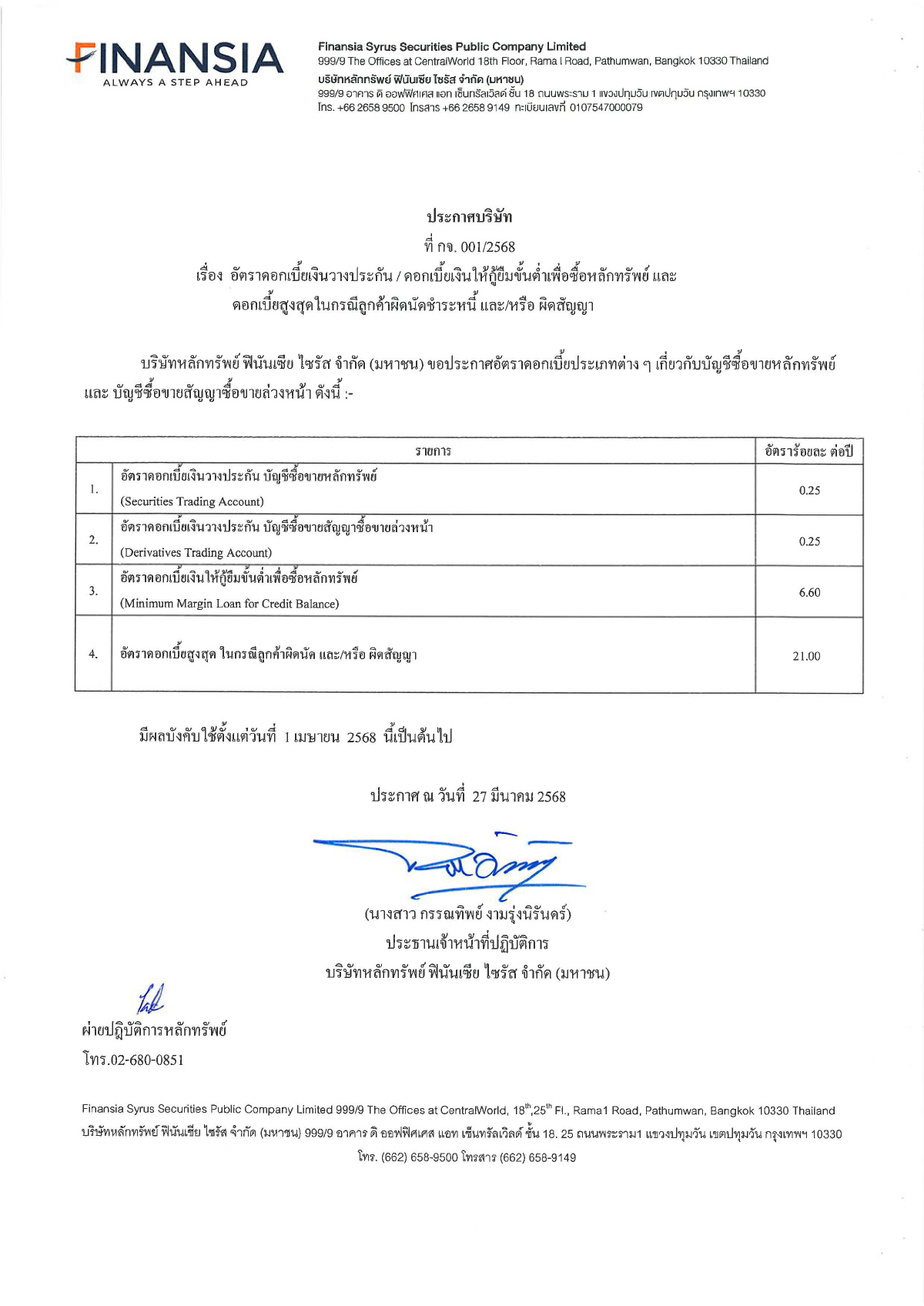 ประกาศเรื่อง อัตราดอกเบี้ยเงินวางประกัน / ดอกเบี้ยเงินให้กู้ยืมขั้นต่ำเพื่อซื้อหลักทรัพย์ และดอกเบี้ยสูงสุดในกรณีลูกค้าผิดนัดชำระหนี้ และ/หรือ ผิดสัญญา มีผลตั้งแต่วันที่ 1 เมษายน 2568
